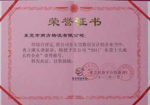 管總獲年度十大經濟人物 公司當選十大企業(yè) 在2012年東莞經濟年會“成長的東莞”評選中,管總當選“2011年度東莞十大經濟人物”,南方物流公司當選“2011年度東莞十大最具成長性企業(yè)”。